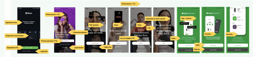 Considering the onboarding of digital products it is important to show more than one screen to present the product and it benefits, some of them use automatic transitions to show the information. This information is clear and short, always next to an image that helps to explain the product. ( the credit card is always there)